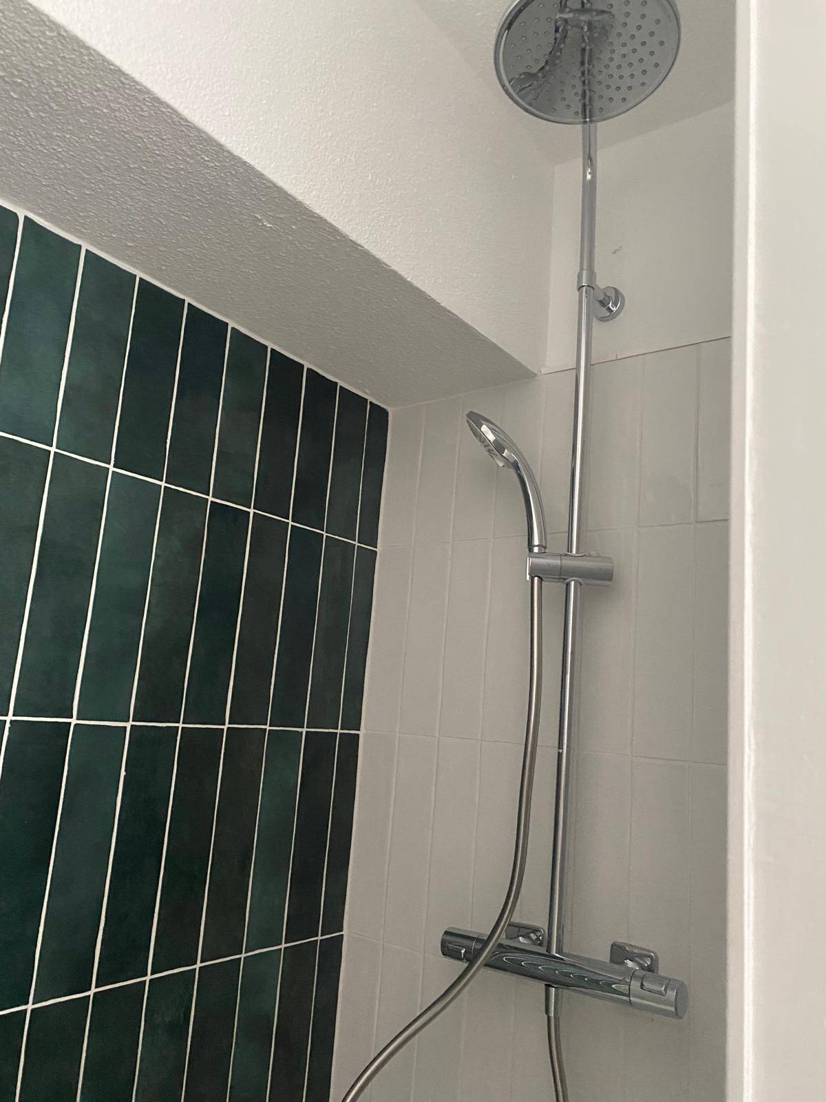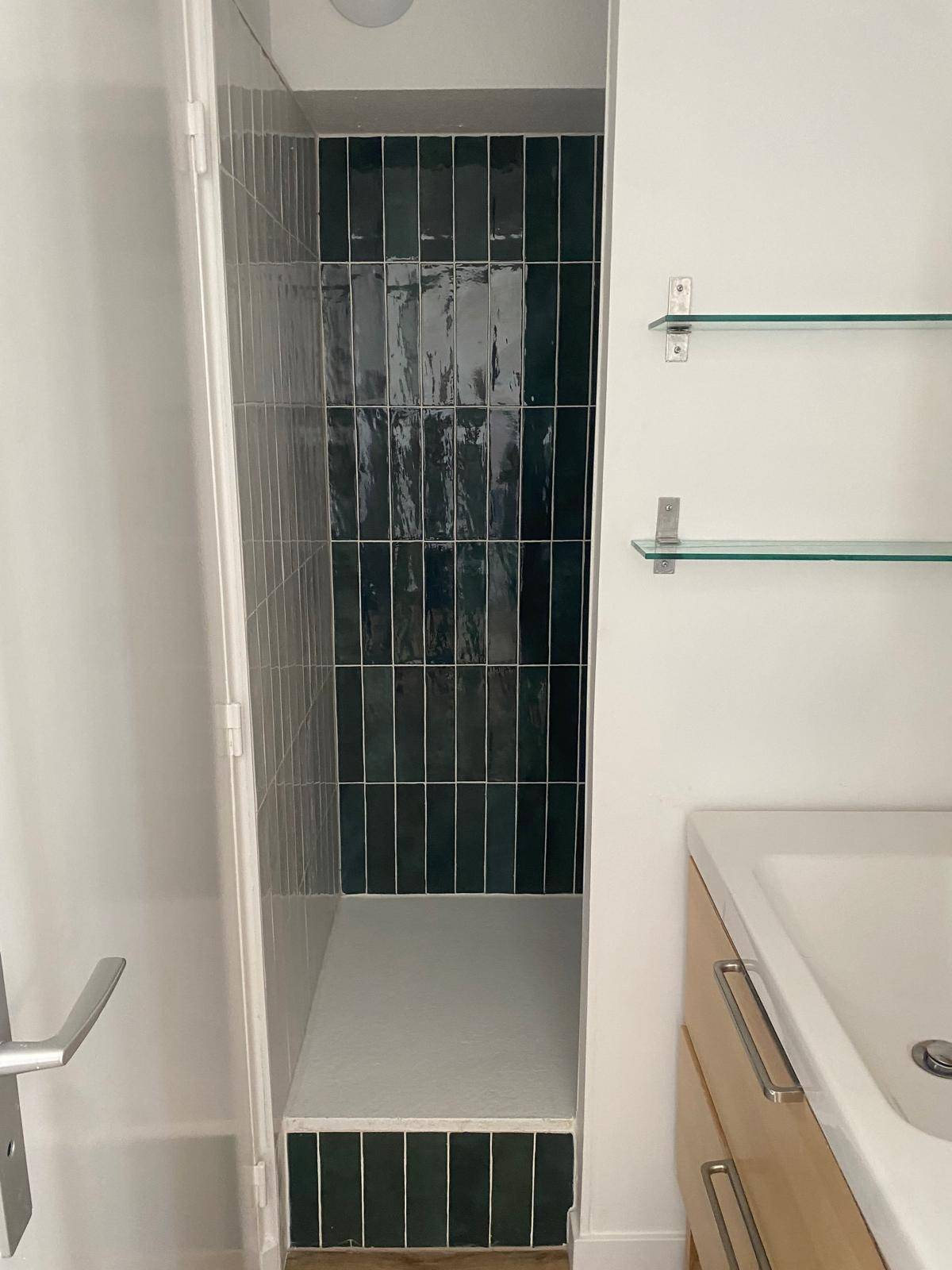 Installation verticale d'une faïence verte pour apporter de la modernité, autour du bac à douche